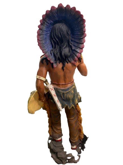 Esta imponente figura de 30 pulgadas de altura representa al guerrero indígena con su arco y flecha, conocida en las tradiciones espirituales por sus propiedades de protección, caza espiritual, precisión en objetivos y conexión con la naturaleza y los espíritus de la tierra.