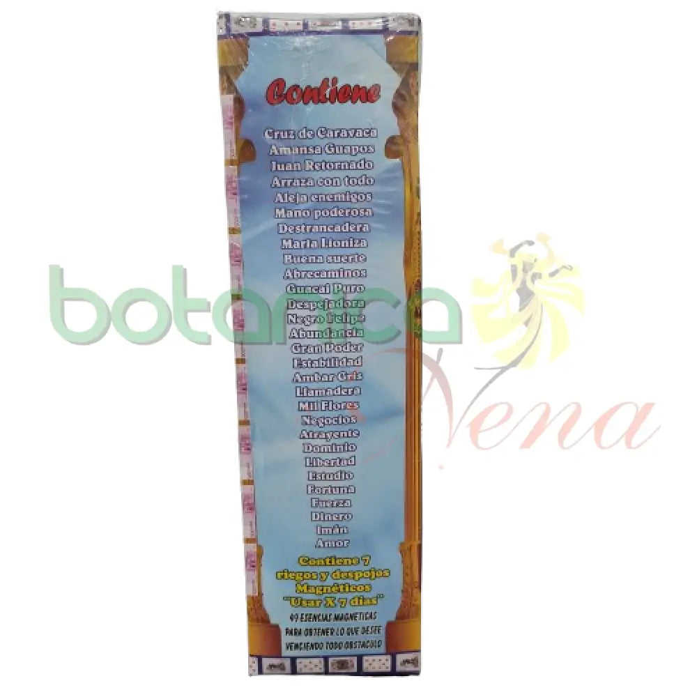 Contiene: Cruz de Caravaca, amansa guapos, juan retornado, arraza con todo, mano poderosa, destrancadera, maria lioniza, buena suerte, abrecaminos, guacai puro, despeadora, negro felipe, abundancia, gran poder, estabilidad, ambar gris, llamadera, mil fores,negocios, atrayente, dominio, libertad, estudio, fortuna, fuerza, dinero, iman, amor.