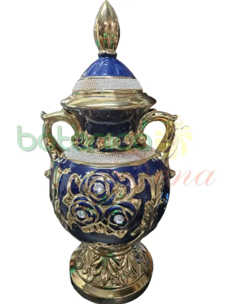 The Potiche Yemaya, also known as an Orisha Soup Tureen, is a sacred porcelain vessel used in Yoruba and Santería spiritual practices to honor Yemaya, the Orisha of the ocean, motherhood, and protection. Yemaya embodies the qualities of nurturing, fertility, and abundance, representing the depth and mystery of the sea. The blue color of this tureen reflects the tranquil and powerful energy of the ocean, while the rhinestones and gold accents symbolize luxury, abundance, and divine favor. Measuring 12" x 11" x 23", this tureen is designed to hold sacred offerings during rituals dedicated to Yemaya, inviting her blessings of protection, emotional healing, and prosperity.